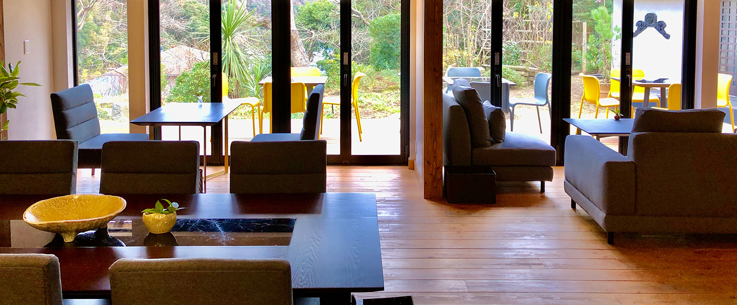 cafeにはウオルナットとダークグレーを基調とし、ゴールドのメタルやイタリア製のライトをスタイリングし、古民家の梁とのコーディネィト。