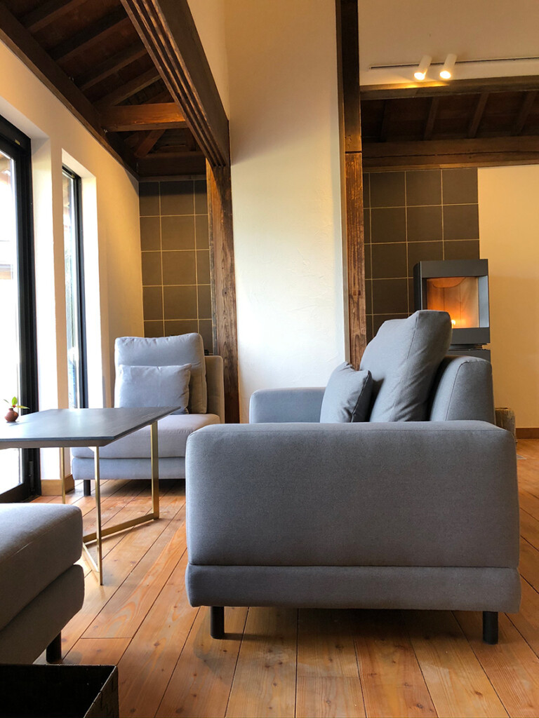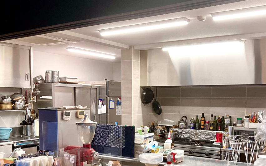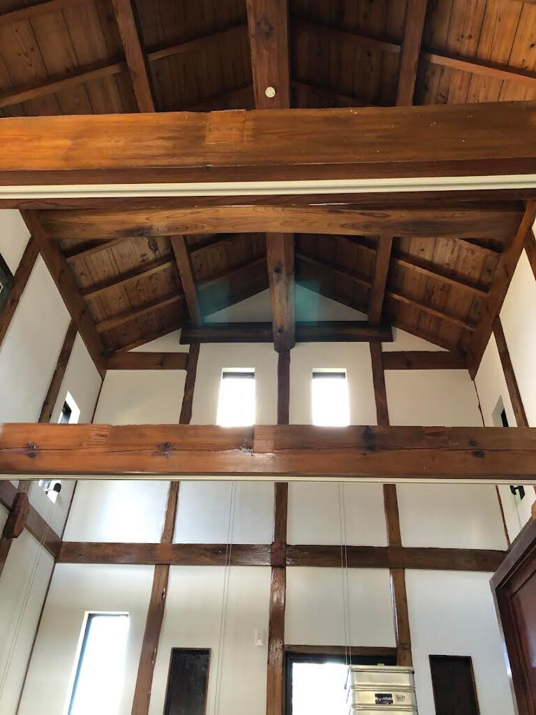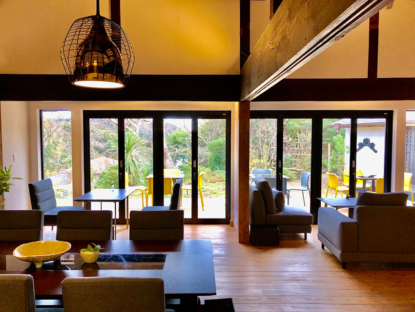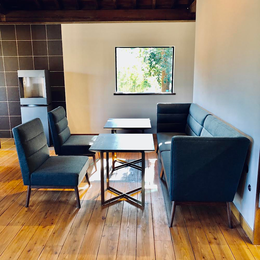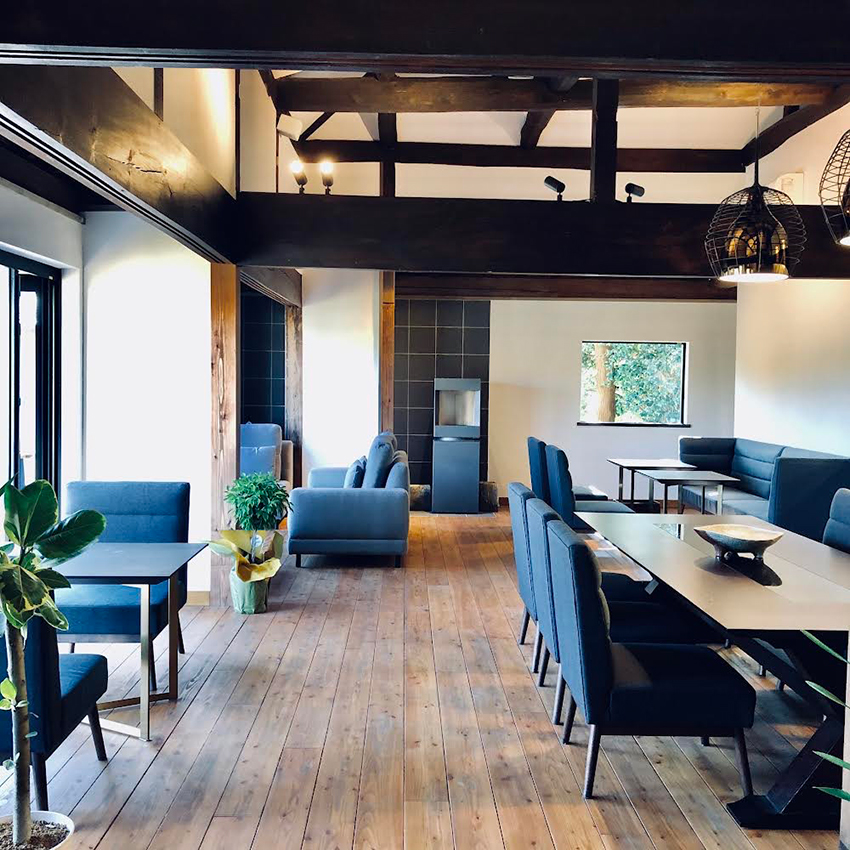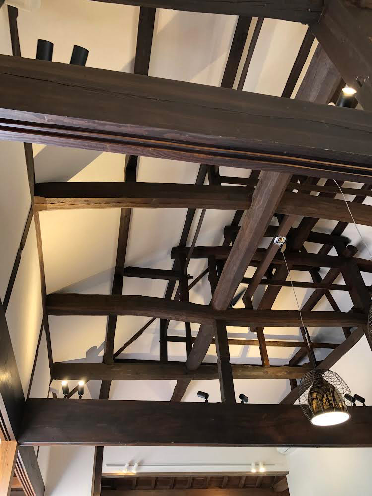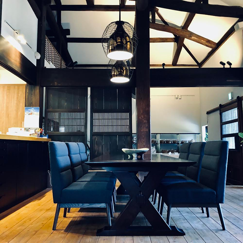 cafeにはウオルナットとダークグレーを基調とし、ゴールドのメタルやイタリア製のライトをスタイリングし、古民家の梁とのコーディネィト。